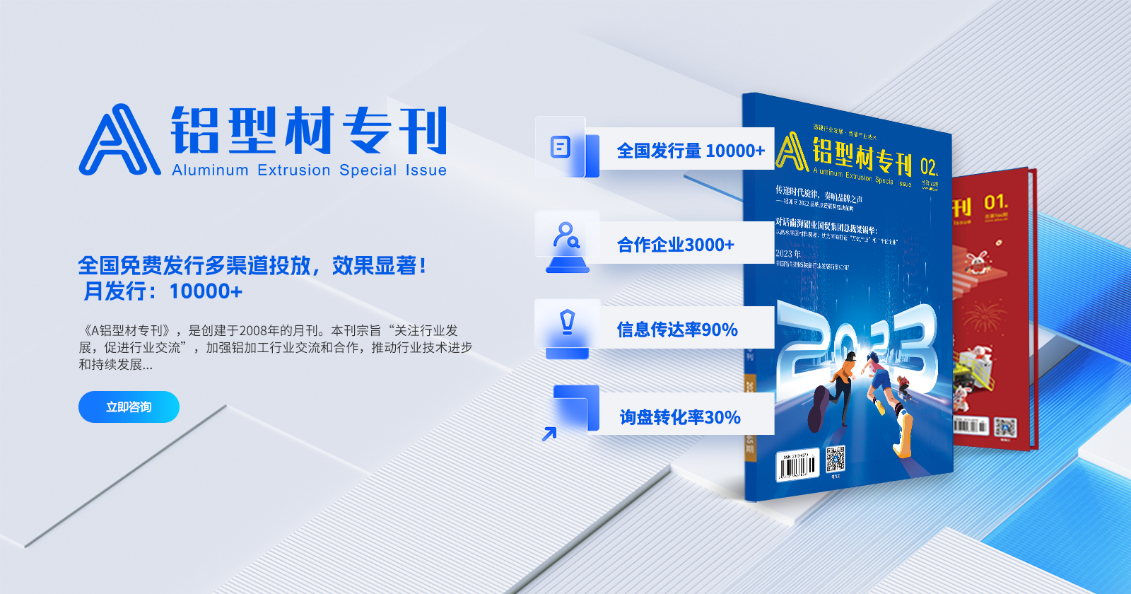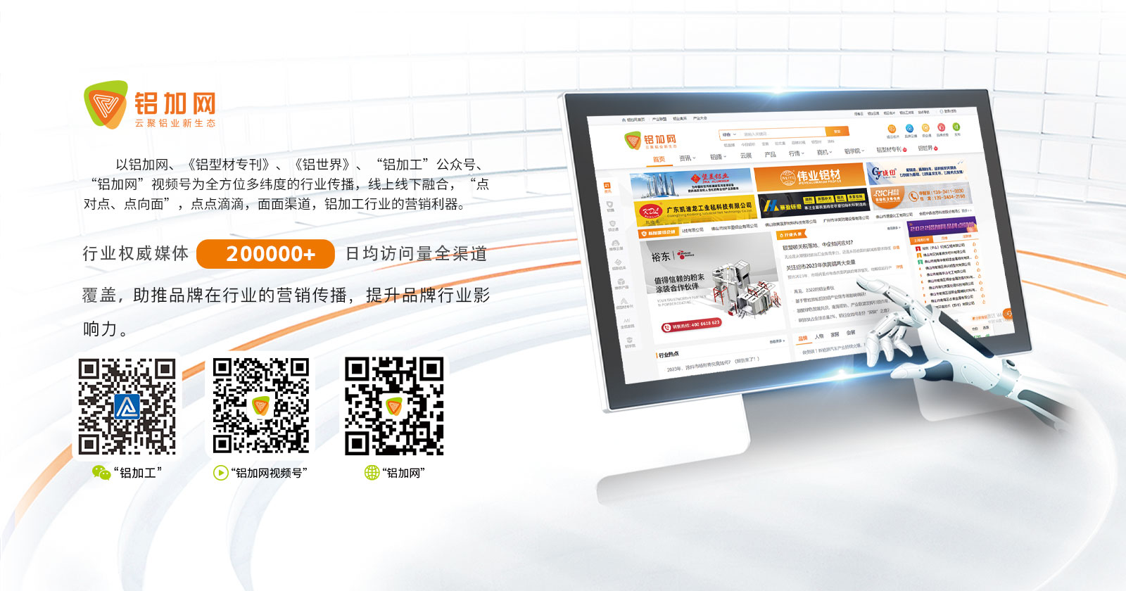 鋁加網(wǎng)(www.albiz.cn)是聞名鋁加工行業(yè)的垂直門戶網(wǎng)站,云聚鋁業(yè)新生態(tài),構(gòu)建鋁業(yè)新場景,以albiz.cn 網(wǎng)站為核心,以移動云端、鋁加工微信、鋁加網(wǎng)視頻號、《鋁型材專刊》和《鋁世界》雜志為載體,成為了鋁加工行業(yè)資訊和精準(zhǔn)傳播的首選傳媒。鋁加網(wǎng),采集和發(fā)布全行業(yè)信息資訊,提供線上展覽、在線直播、短視頻、品牌策劃、品牌運營、品牌傳播等全方位的專業(yè)服務(wù)。